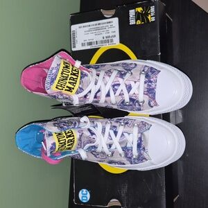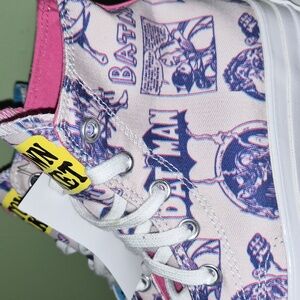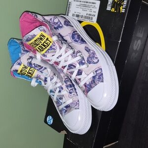 High-top sneakers featuring vibrant pink and blue accents. Classic Converse style.