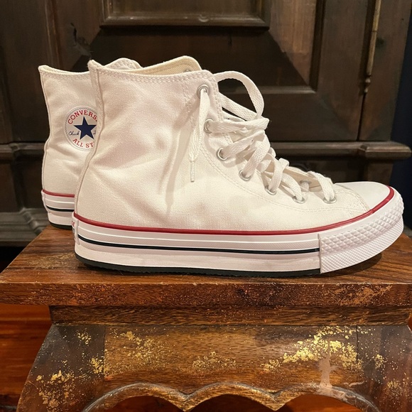 Stylish white high-tops with red stripe detail. Signature Converse design. Size 6