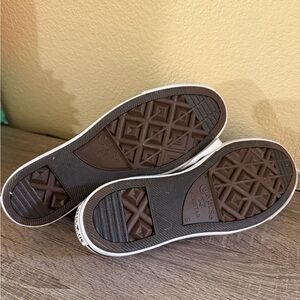 Stylish Converse high-tops with burnt orange canvas. Features white laces and rubber soles. Men sz 6, women’s sz 8.