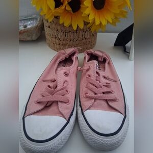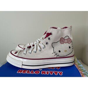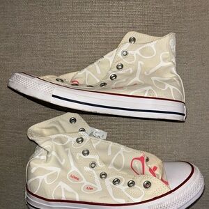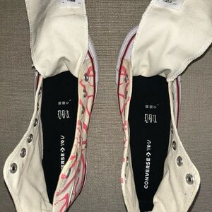 CUSTOM Stylish Converse high-tops featuring a vibrant pink and cream glasses pattern. Iconic logo and classic lace-up style. Some marks but shoes have been washed and sanitized. Only worn once