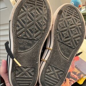 Classic black Converse sneakers with gold accents. High-top design for style and support. Perfect for everyday wear.