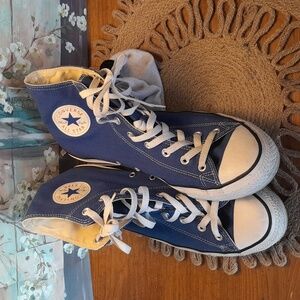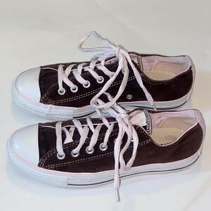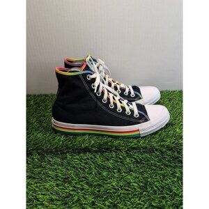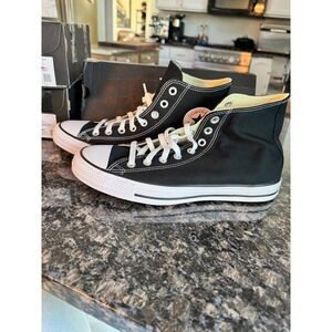 Classic black sneakers with white laces. Comfortable and stylish for everyday wear. Size 8, in men 10 and women.