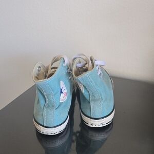 Stylish Converse sneakers for kids. Light blue canvas with white laces and soles. Classic high-top design.