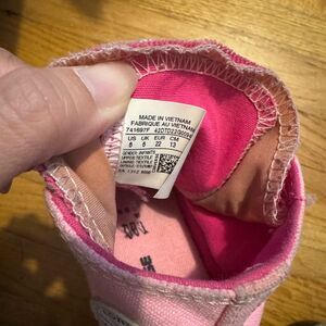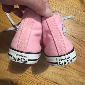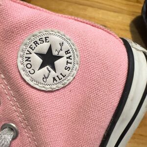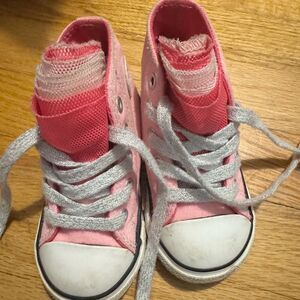 Charming pink Converse sneakers for kids. High-top design with classic white accents. Ideal for play and style. Good condition