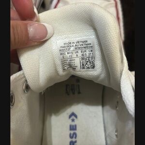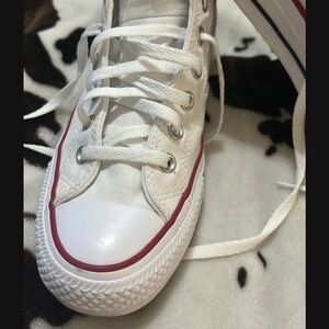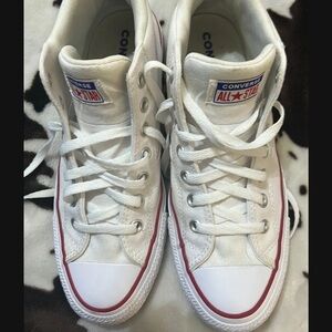 Classic Converse high-tops for kids. White canvas with red and blue details. Durable and stylish.