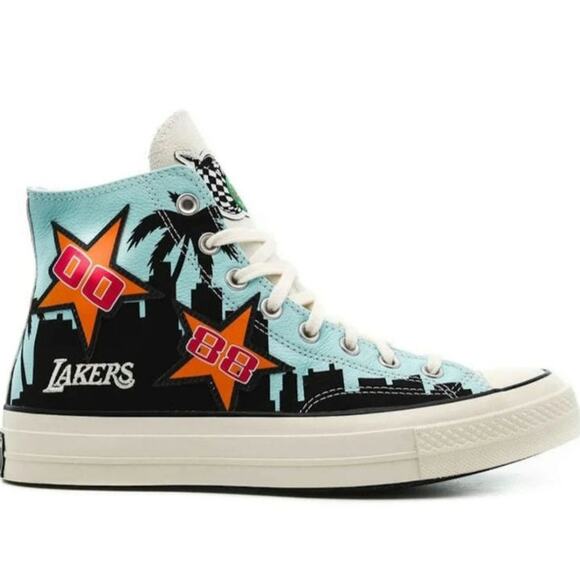 The Chinatown Market x Converse Chuck 70 High 'Lakers Championship Jacket' is drawn from a four-piece collection made in partnership with the LA streetwear label. Inspired by the custom championship jacket designed by Jeff Hamilton for the '02 Lakers, the high-top is attired in a sky blue leather upper with colorful graphics that include palm trees and the LA skyline. Unique branding elements include a translucent All Star patch on the medial ankle and a Chinatown Market license plate on the heel of the left shoe.