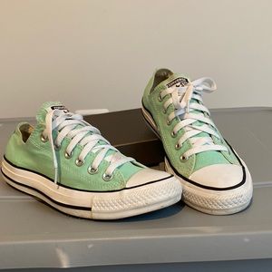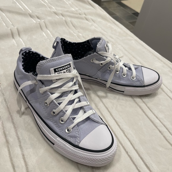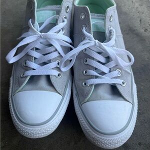 Classic Converse sneakers in light gray. Features white laces and black trim.