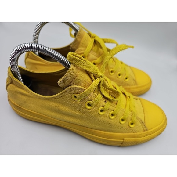 Converse low top shoes in a solid yellow color, designed for men with a US shoe size of 5 and women with a size of 7. These casual sneakers feature a lace-up closure, lightweight fabric upper material, and offer comfort for everyday wear. Perfect for adding a pop of color to any casual outfit and providing all-day comfort.