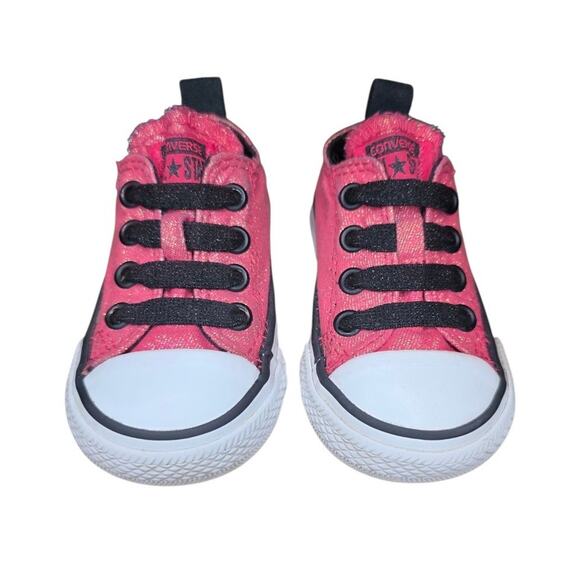 Adorable Converse Chuck Taylor All Star low tops for toddlers, featuring a pink sparkle canvas design with classic rubber toe caps and black laces. Easy slip-on style with elastic laces and heel pull tabs — perfect for little ones on the go.