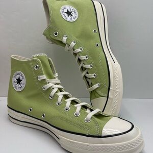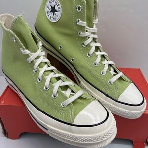 Classic Converse high tops in light green. Features white laces and sole. Iconic logo on the side.
