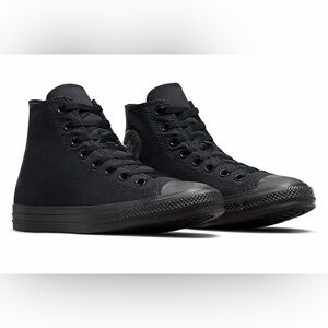 Sleek all-black design. Iconic high-top style. Versatile and timeless. These sneakers are in good condition.