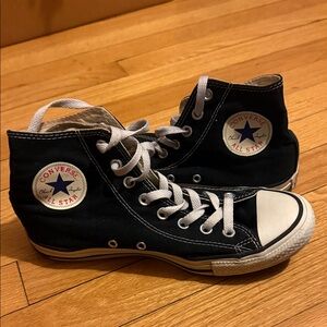 Sleek black Converse sneakers with white accents. Ideal for everyday wear. Classic and comfortable design.