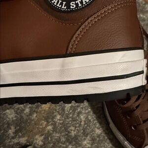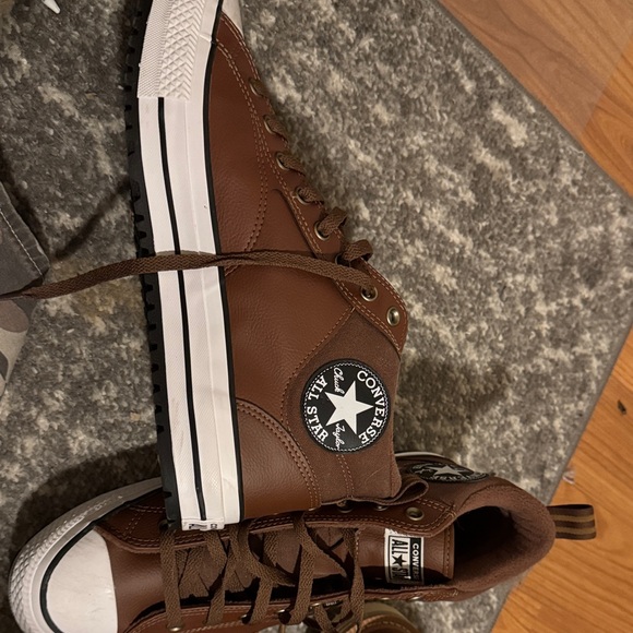 Classic Converse sneakers in rich brown leather. High-top design with iconic logo. Perfect for everyday wear.