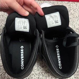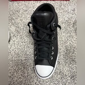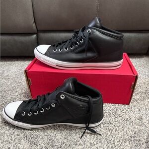 These are men's size 10 Chuck Taylor All Star High Street Sneakers. These are new in the box and never worn. These sneakers are made out of black leather and feature the Converse All Star on the side. These men's converse feature the traditional converse design and are made out of a durable leather material. These shoes are a perfect addition to your winter and fall wardrobe.