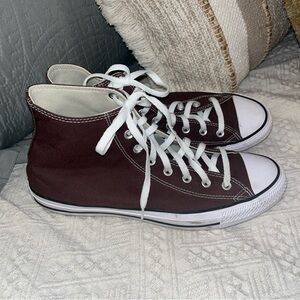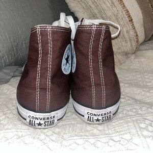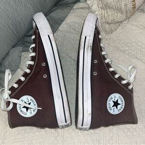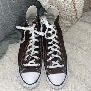Classic Converse high-tops in dark brown. Features white laces and sole. Iconic style for everyday wear. Excellent shape. Smoke free