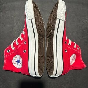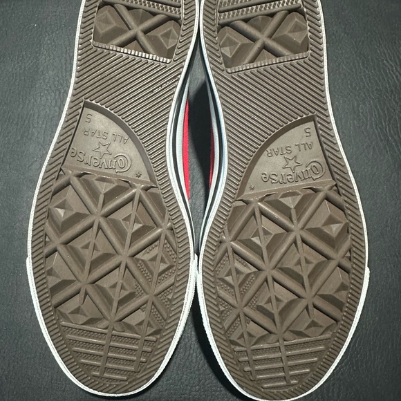 Classic Converse sneakers with a red and white upper. Durable brown sole for everyday wear. Stylish and versatile.