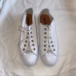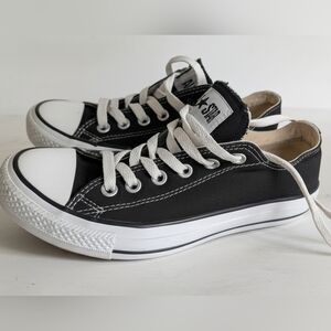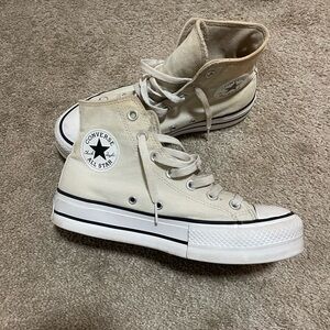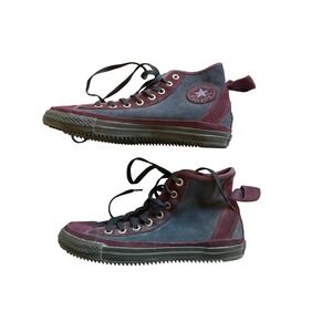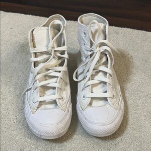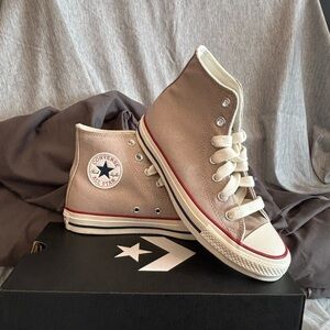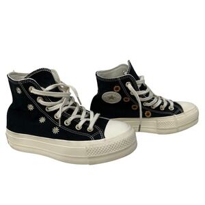 P Elevate your sneaker game with these Converse Chuck 70 High Top sneakers. With a stylish silver, egret, and black colorway, these shoes are perfect for any industrial glam look. The synthetic upper material and high-top shoe shaft style provide both durability and comfort. These sneakers are a women's size 6.5 and feature the iconic Converse All Star- 568796c style code. The sneakers are part of the Converse Chuck 70 product line and are perfect for any athletic occasion. Don't miss out on adding these stylish sneakers to your wardrobe.