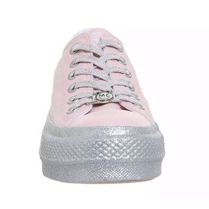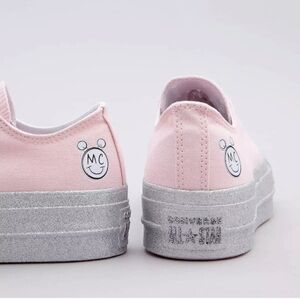The same glittery motif is repeated on the flat laces, complemented by a canvas upper finished in a pale pink hue. a stylized ‘MC’ smiley-face logo – adorns the heel and lace jewels.