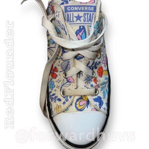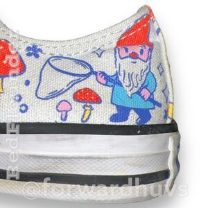 Get ready to step into an enchanting world with these adorable Converse sneakers in junior size 3. The whimsical design features an array of delightful elements, from charming butterflies and mischievous gnomes to mushrooms and vibrant flowers, all intertwined in a playful dance.