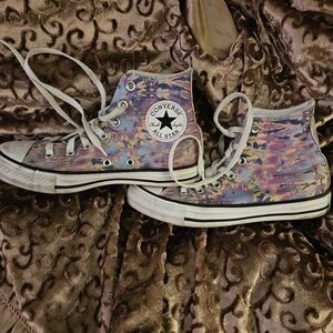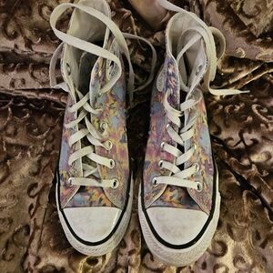 Vibrant high tops with purple, pink, blue and orange pattern. Classic Converse style with a unique twist. These sneakers are so unique and in super condition!