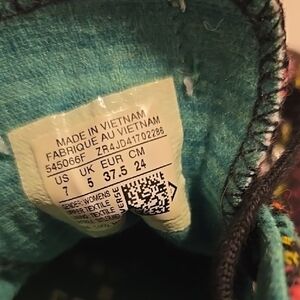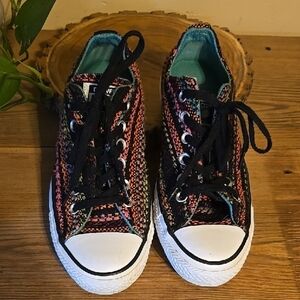 Converse sneakers featuring a vibrant knit pattern. Black laces and white soles complete the look.