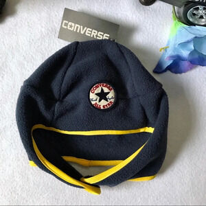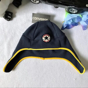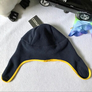 NWT. Fleece Beanie for Toddler One Size. Navy with yellow seam accent, ear flaps with velcro, patch logo front. Pictures are part of description.