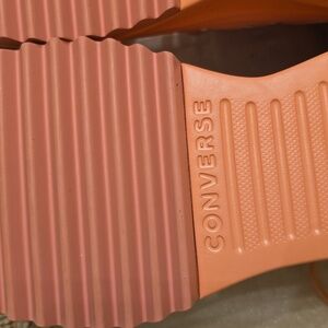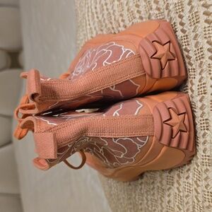 Bold pink high-tops with floral accents. Stylish and comfortable for everyday wear. Converse Natasha Cloud x Run Star Hike inspired Floral Pink Quartz. The color is more pink and less yellow.