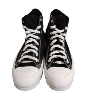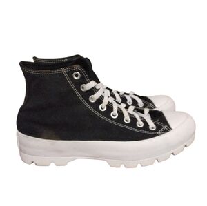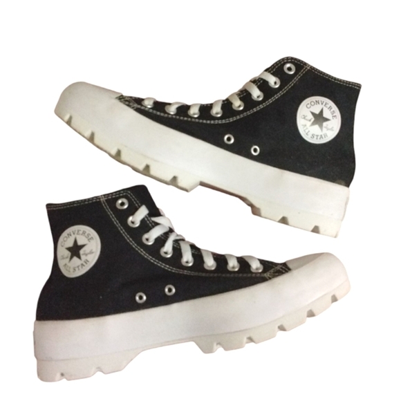 Classic Converse high top sneakers with white platform soles. Features iconic Converse logo.