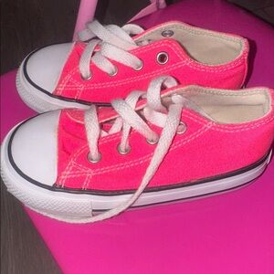 Vibrant neon pink Converse sneakers. Features white laces and durable rubber soles. Ideal for everyday style.