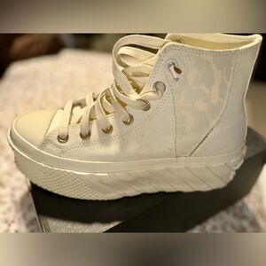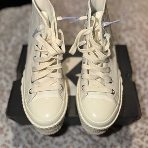 Elevate your style with these Converse platform high-tops. Off-white canvas with sturdy lace-up design.