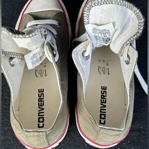 Chic olive green low-top Converse sneakers. Features white laces and toe caps. Red detailing adds a pop of color.