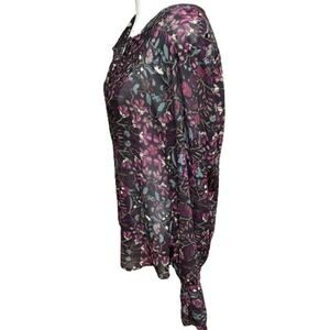 This Converse One Star multicolor long sleeve top is a stylish and casual addition to your wardrobe. Made from 100% polyester, this top is lightweight and comfortable. It features a vibrant floral pattern in shades of purple, pink, teal, and beige on a dark background, giving it a boho-chic appeal. The size medium fit is designed to be flattering and relaxed, with pintuck details on the front and a button-up neckline adding to its casual charm.