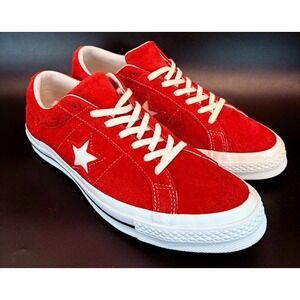 Classic sneakers in a vibrant red suede. These Converse One Star low tops feature the iconic star emblem, offering a blend of vintage appeal and modern style. The shoe's clean white midsole provides a striking contrast, complementing its overall aesthetic. Perfect for completing a casual weekend outfit, adding a pop of color to your everyday streetwear, or even for light skate sessions.