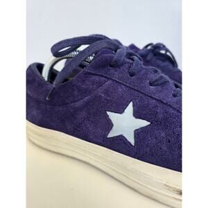 Rare Converse One Star low-top sneakers in deep purple suede, size 10.5 men’s / 12 women’s. Iconic retro skate style with classic white star detail and vulcanized rubber sole. Water-repellent “Counter Climate” edition, perfect for streetwear lovers and sneaker collectors alike.
