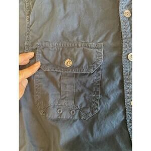 This is a Converse button-up shirt for men in size small. It has a blue solid pattern made of cotton material. The shirt has short sleeves, a collared neckline, and a button-down collar style. It is a regular fit and can be machine washed. The shirt has a chest size of 19.5 inches and is suitable for casual occasions. The shirt has a USA, Hawaiian, and Classic theme, making it perfect for summer, fall, and spring seasons.