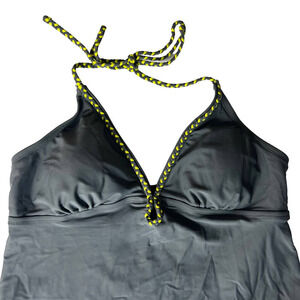 Grey tankini top with yellow and grey braided tie strap at neck and around neckline.