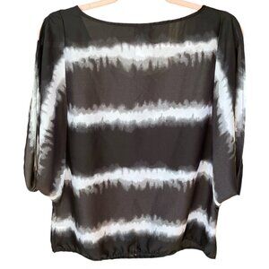 Style: Black & white tie dye stripe, round neck, keyhole cutout, short sleeve split down the top.