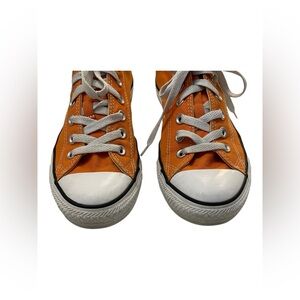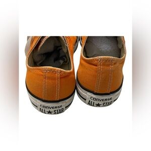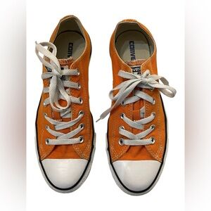 Vibrant orange Converse sneakers. Classic low-top design. Durable canvas material. Iconic rubber sole.