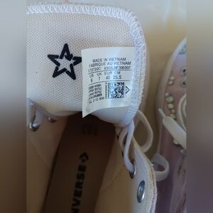 These Converse sneakers feature a vibrant pink color and a classic high-top design, enhanced with eye-catching sparkly studs on the toe cap. Crafted for both style and comfort, they offer padded ankle support and a fashionable twist on a timeless silhouette.