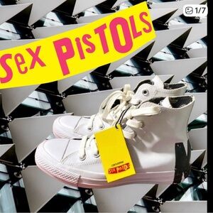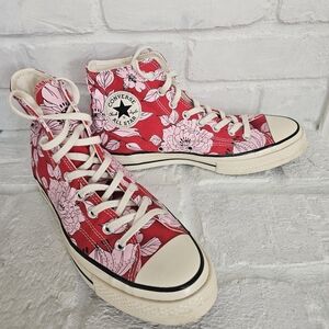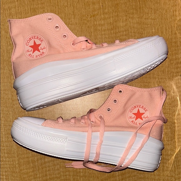 Stylish Converse high-top sneakers. Features a pink canvas upper with white rubber sole. Iconic Converse logo on the side.