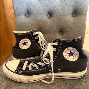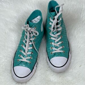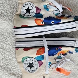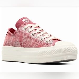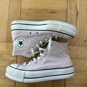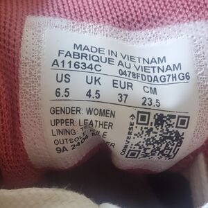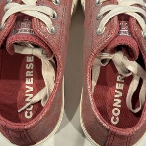 Stylish pink Converse sneakers with white accents. Classic design with durable sole. Perfect for casual wear.