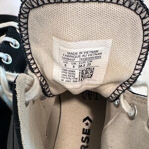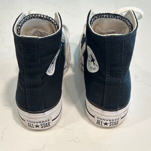Stylish Converse high-tops in black. Features white laces and rubber sole.