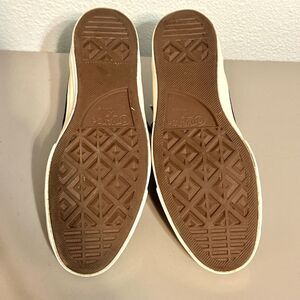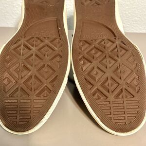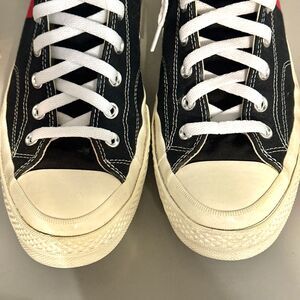 These Converse Play sneakers are a stylish addition to any wardrobe. Featuring a classic black canvas upper with the iconic heart logo, they offer a unique twist on a timeless design. The high-top silhouette provides support and a trendy look, making them perfect for casual outings or streetwear ensembles. The rubber outsole ensures durability and traction, while the textile upper keeps them lightweight and comfortable. Ideal for everyday wear, these sneakers are versatile enough to pair with a variety of outfits. See measurements in photos. There is some slight yellowing in the outsole that tends to occur with this type of shoes.