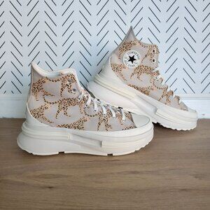 These Converse high-top sneakers feature a striking leopard print design. With a chunky platform sole and durable construction, they offer both style and comfort.