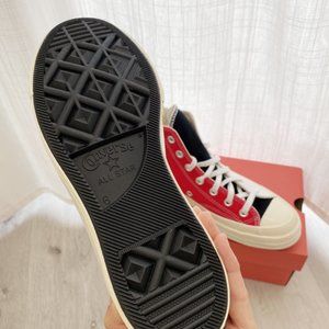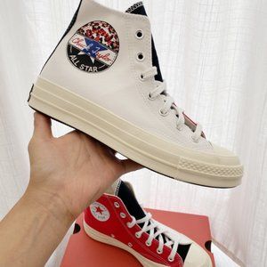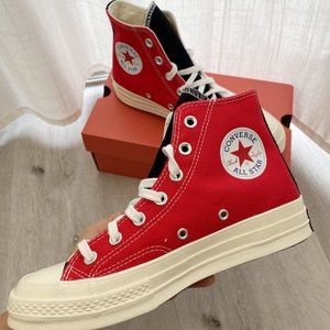 Stylish Converse high-tops. Bold red and classic white design. Iconic logo detail.