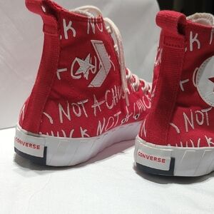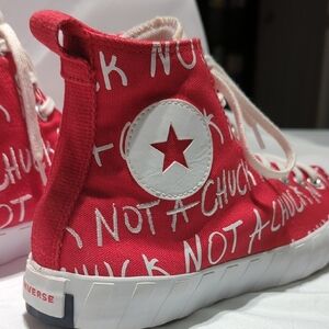 Bold red high-tops with white accents. Iconic Converse star logo. Comfortable and stylish. these Converse shoes are in great pre-owned condition. size 11 men's they say all over the side not a Chuck not a Chuck. not a Chuck. they're awesome condition. unfortunately they don't fit me. I bought them thinking they would just a hair too small so letting them go. they're an overall great condition. please look at photos. honestly amazing pre-owned shoes. very very nice. they have been washed and sanitized as I was going to use them myself but unfortunately they did not fit. very nice. thank you