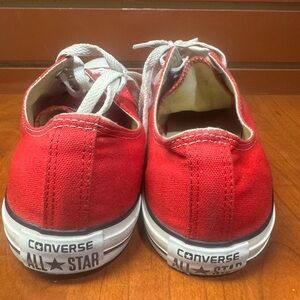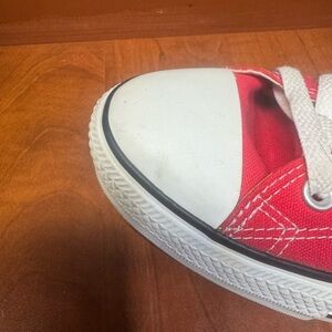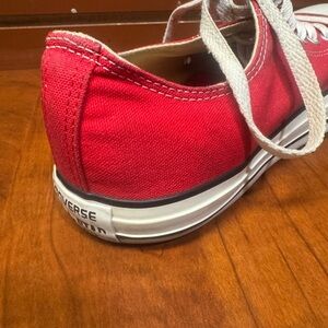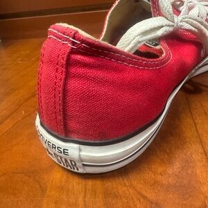 Classic Converse sneakers. Vibrant red canvas. White laces and toe cap. Timeless style.