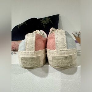 The Converse Chuck 70 Low ‘Tri-Panel Renew Pack’ is drawn from a sustainable collection that utilizes the brand’s own discarded cotton scraps, gathered directly from the factory floor. The upper, crafted from approximately 20% recycled cotton canvas, features mismatched blue and pink paneling on the sneaker’s lateral and medial sides. The laces are woven with recycled polyester, while the speckled outsole is made with regrind rubbe