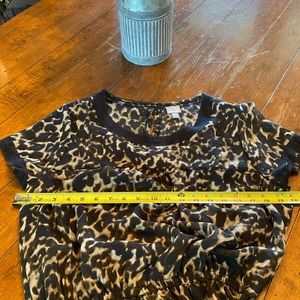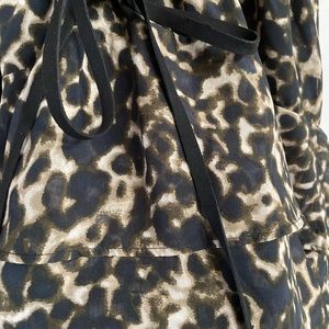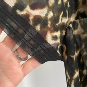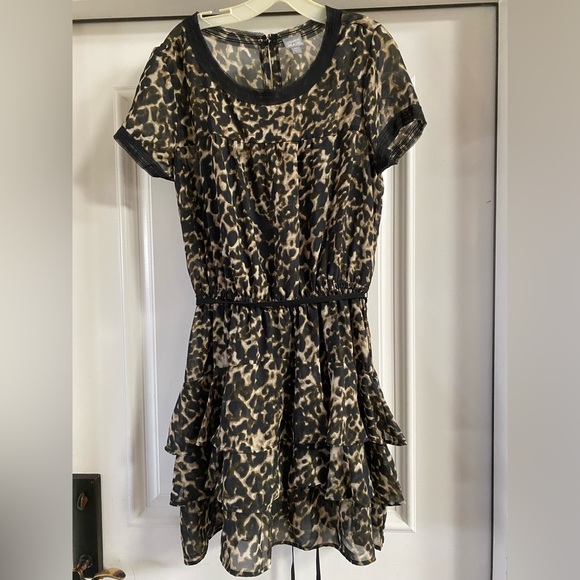Converse short sleeved, animal print, ruffled dress. Black thin fabric belt that goes around the waist. Waist is elastic. Has a black, spaghetti strap dress that lines the outer sheer animal print dress. Material is polyester. Rarely worn, in excellent condition with no signs of wear, rips or stains.