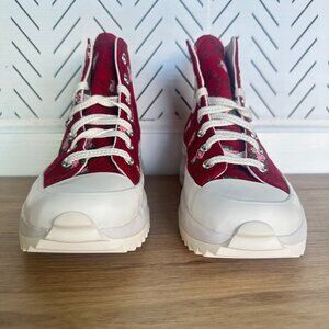 These Converse sneakers feature a striking red and white color scheme, combining classic high-top styling with a modern chunky platform sole. The shoes are designed with a durable canvas upper, white rubber toe cap, and a distinctive jagged outsole tread pattern for added grip and style.